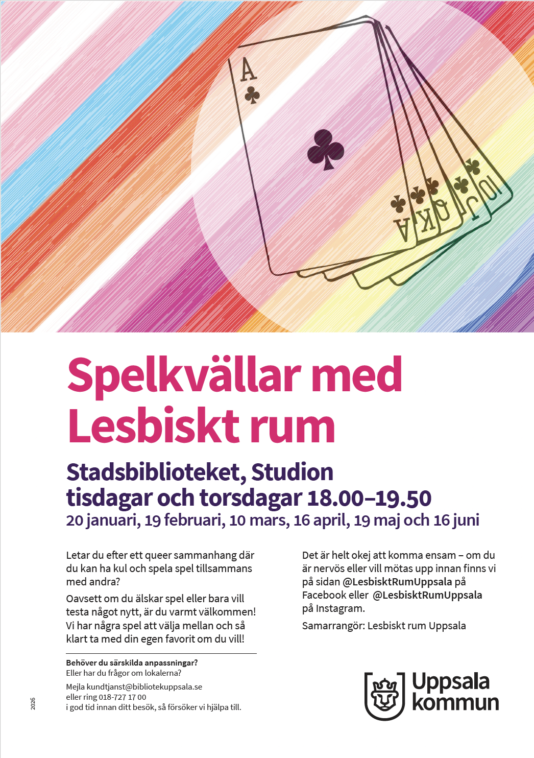 Det är okej att komma ensam, om du är nervös eller vill mötas upp finns vi på sidan @LesbisktRumUppsala på Facebook. 🙂